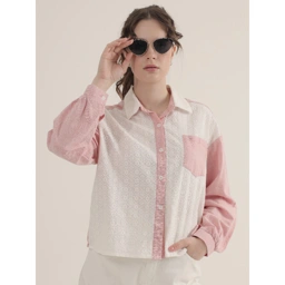 Blouse lengan panjang dengan kombinasi warna putih dan pink, dilengkapi kancing depan dan saku kecil di dada. Desainnya unik namun tetap simpel, cocok untuk tampilan kasual yang manis dan stylish.