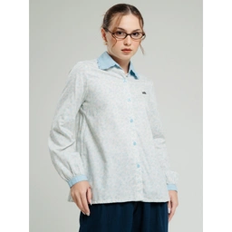 Blouse dengan desain klasik yang dipadukan sentuhan modern melalui detail kerah berwarna biru muda. Perpaduan warna netral dan lembut menciptakan tampilan clean namun tetap standout. Potongan lurus dengan kancing depan memberikan kesan rapi dan mudah dipadupadankan untuk berbagai suasana, dari kasual hingga semi-formal.