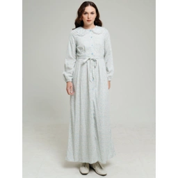 Dress panjang bermotif floral kecil ini menghadirkan pesona feminin yang lembut dan manis. Didesain dengan kerah lebar bergaya Peter Pan berhiaskan renda tipis yang memberikan nuansa vintage yang anggun. Detail kancing depan penuh dan tali serut di pinggang memudahkan pemakaian sekaligus membentuk siluet tubuh yang lebih proporsional.