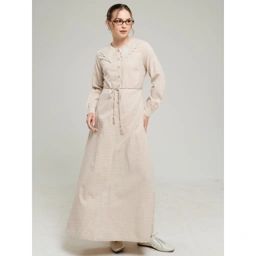 Long dress tangan panjang dengan desain feminin dan sentuhan klasik yang elegan. Didesain dengan kerah lebar bermotif renda halus yang memberikan kesan manis dan lembut. Bagian depan dilengkapi kancing penuh serta tali serut di pinggang untuk menonjolkan siluet tubuh dengan anggun.