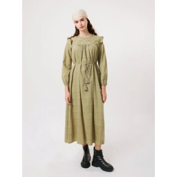 Dress panjang ini tampil anggun dengan nuansa lembut dan feminin. Didesain dengan detail bordir halus di bagian dada serta ruffle pada bahu yang memberi sentuhan manis dan elegan. Potongan A-line dengan tali serut di pinggang membantu membentuk siluet tubuh dengan proporsional.