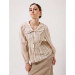 Blouse bermotif garis vertikal dengan desain klasik yang feminin. Dilengkapi kerah lebar dan kancing depan yang memberi kesan rapi dan anggun. Potongan regular fit dengan lengan panjang berujung karet membuatnya nyaman dipakai untuk aktivitas harian maupun acara semi-formal.