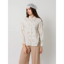 Blouse putih bermotif floral lembut dengan desain klasik yang feminin. Dilengkapi kerah kemeja dan kancing depan yang memberikan tampilan rapi dan anggun. Potongan longgar dengan detail scallop di ujung lengan menambah sentuhan manis, nyaman dikenakan untuk aktivitas harian maupun acara semi-formal.