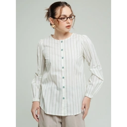Blouse putih bergaris vertikal dengan kancing depan dan lengan panjang. Desain sederhana namun elegan ini memberi kesan feminin dan cocok untuk tampilan kasual maupun semi-formal.