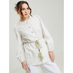 Blouse wanita bermotif kotak-kotak dengan warna dasar putih ini memiliki desain lengan panjang puff dan kancing depan penuh. Dilengkapi detail tali pinggang hijau yang memberikan aksen manis dan menonjolkan siluet tubuh. Cocok untuk tampilan kasual rapi maupun acara semi-formal.