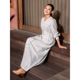 Dress panjang bermotif kotak halus ini menampilkan gaya klasik yang simpel namun tetap elegan. Didesain dengan bukaan kancing penuh di bagian depan, serta lengan panjang dengan detail puff yang memberi volume lembut pada bahu. Kerah bulat kecil (round neckline) menambah kesan manis dan feminin, cocok untuk tampilan kasual rapi maupun semi-formal.