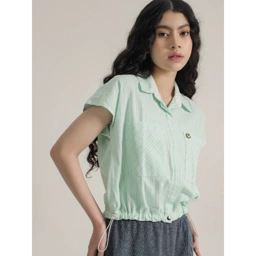 Top dengan warna mint yang fresh dan tekstur garis halus, memberikan tampilan ringan namun tetap standout. Dilengkapi detail adjustable drawstring di bagian bawah untuk siluet yang bisa diatur sesuai style.